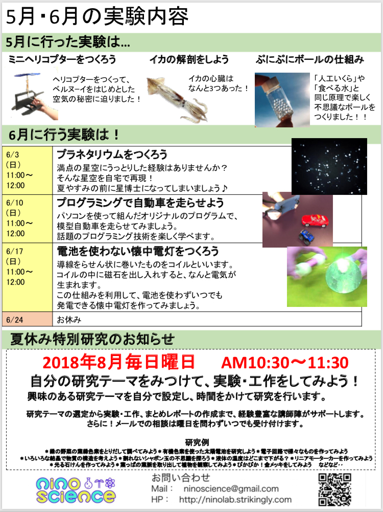 市民に向けた理科教育法について広く深く学び、定期的な授業やワークショップなどを実施。また、講師は教員免許状を取得しており、学校現場での指導経験等も有り。