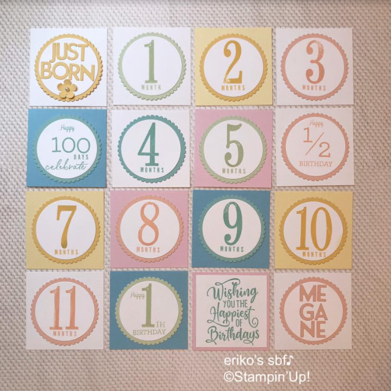 スタンプを使ってマンスリーカードおよび100日祝い等を含めた16枚分を作ります。フレームもついています。お子様のお名前も入れられます。(ご希望の場合はご予約時に備考欄にローマ字をご記入、カラー(水色・黄色・ピンク)のいずれかをお知らせください。)