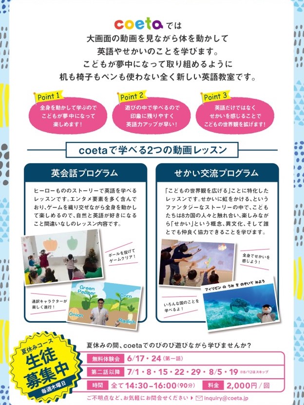 coeta(コエタ)は、こどもたちが「英語」や「外国」を体験できる新しい英会話の場です。