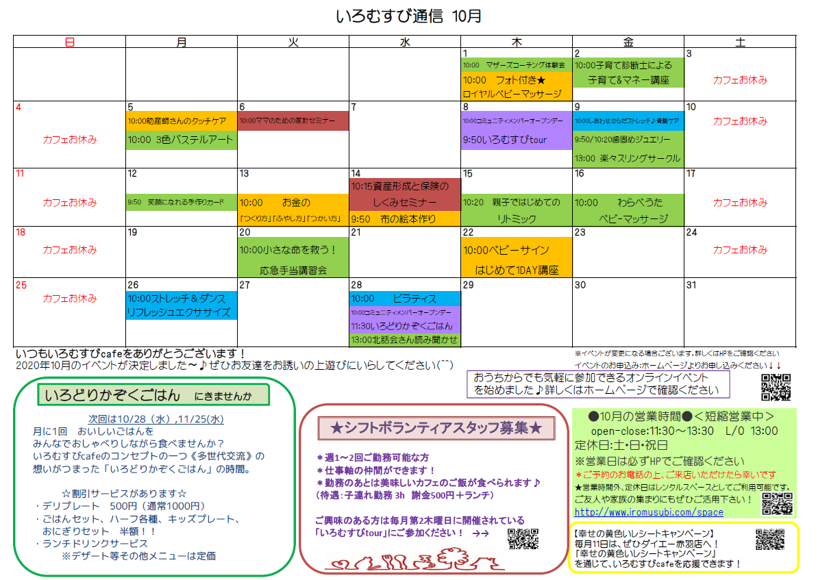 いろむすびcafeの10月のイベントカレンダーです。